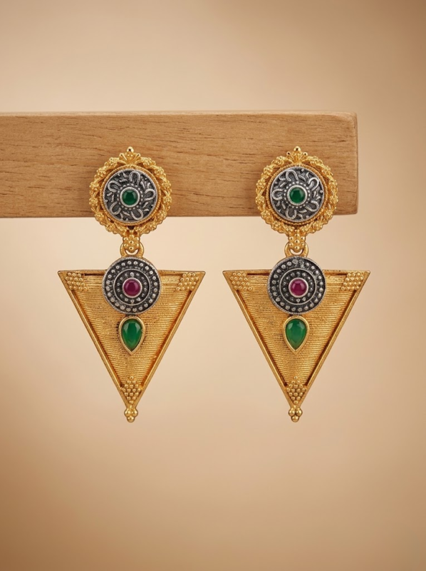 OZ Jewels Gold-Plated Geometric Triangle Drop Earrings with Oxidised Silver Accents and Multicolor Stone Studs