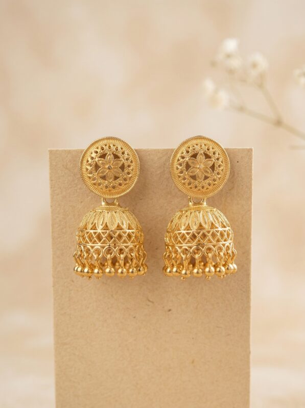 OZ Jewels Premium Gold-Plated Filigree Jhumka Earrings with Floral Studs and Traditional Gold Bead Drops