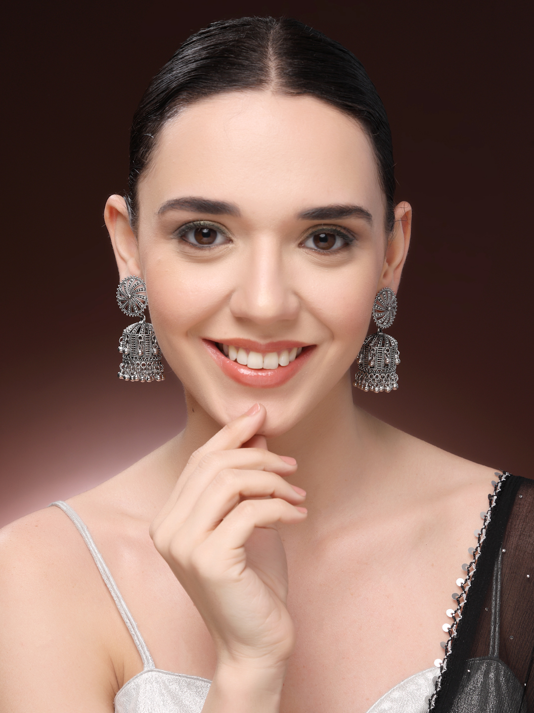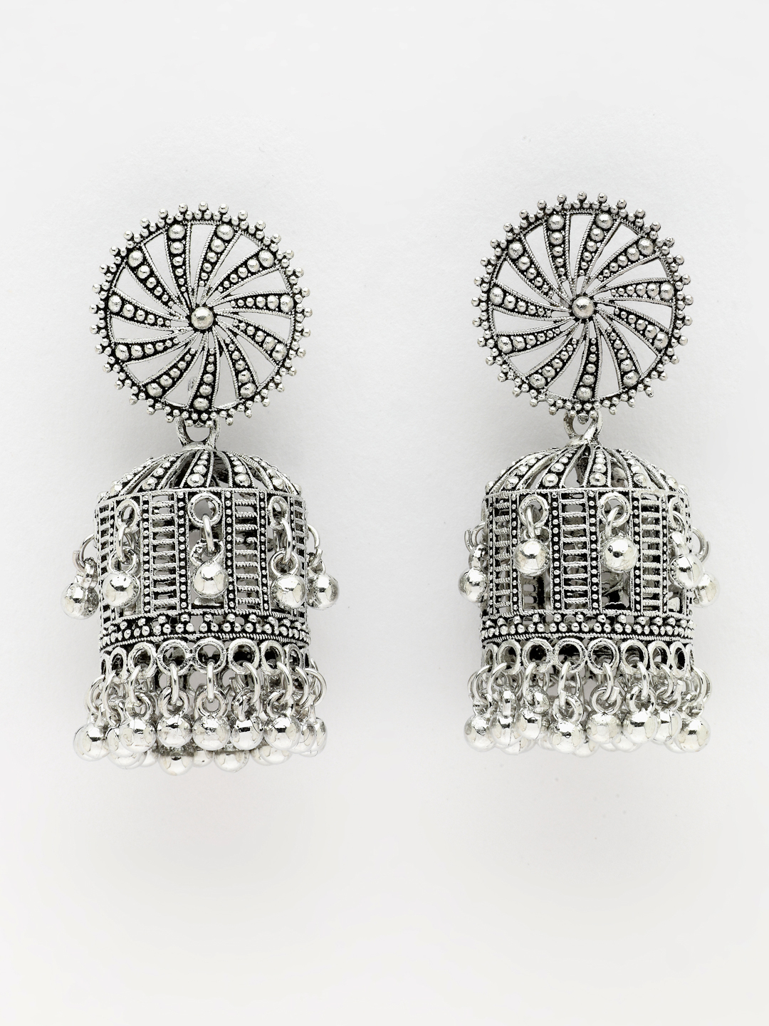 The traditional bell-shaped drop (Jhumka) is uniquely structured with a mesh-like cage design, adding a layer of architectural depth. Each earring is finished with a dense fringe of polished silver beads (ghungroos) at the base and along the sides, creating a soft, rhythmic chime as you move.