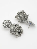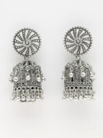 Elevate your ethnic wardrobe with these striking OZ Jewels Oxidized Jhumka Earrings. The standout feature is the oversized, circular stud designed with an intricate “sunburst” or spiral swirl pattern that draws immediate attention. The antique silver finish gives these earrings a timeless, weathered look that defines premium oxidized jewellery.
