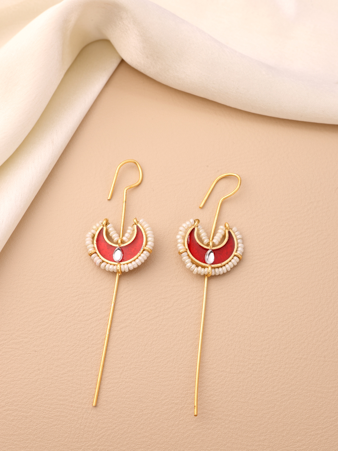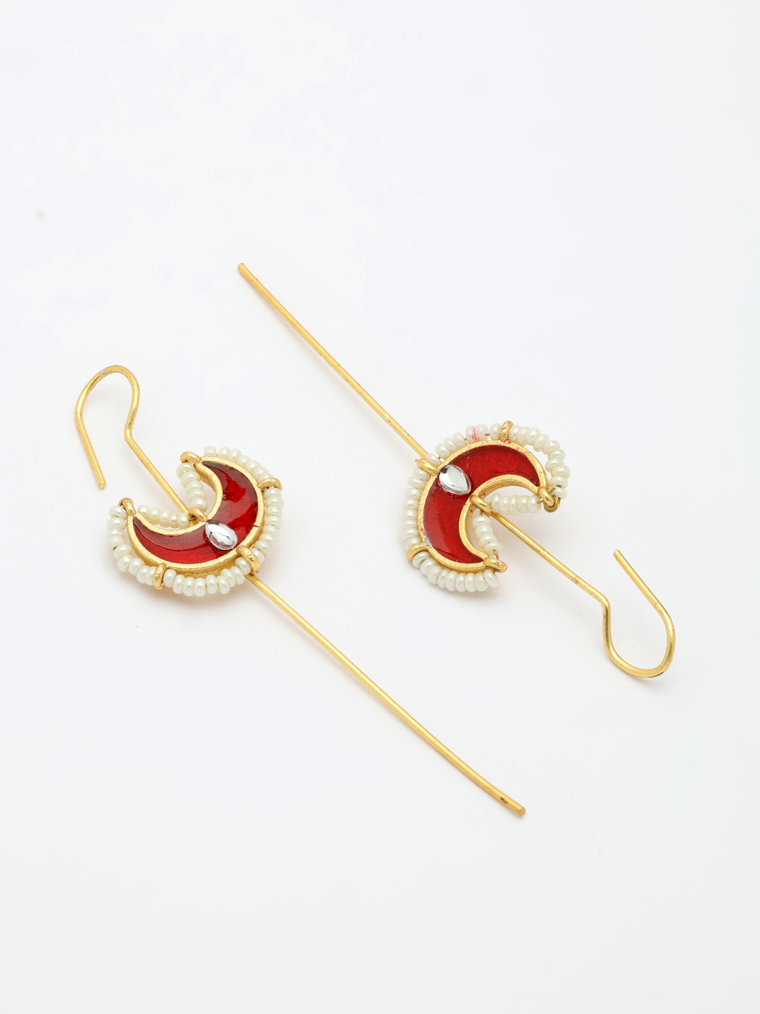 Redefine your style with OZ Jewels Gold-Plated Crescent Moon Ear Cuffs. Featuring a vibrant red enamel crescent accented with delicate white beads and a sleek long-stick drop, these ear-hugging dangles provide a modern, minimalist aesthetic perfect for parties, casual outings, and contemporary ethnic wear.