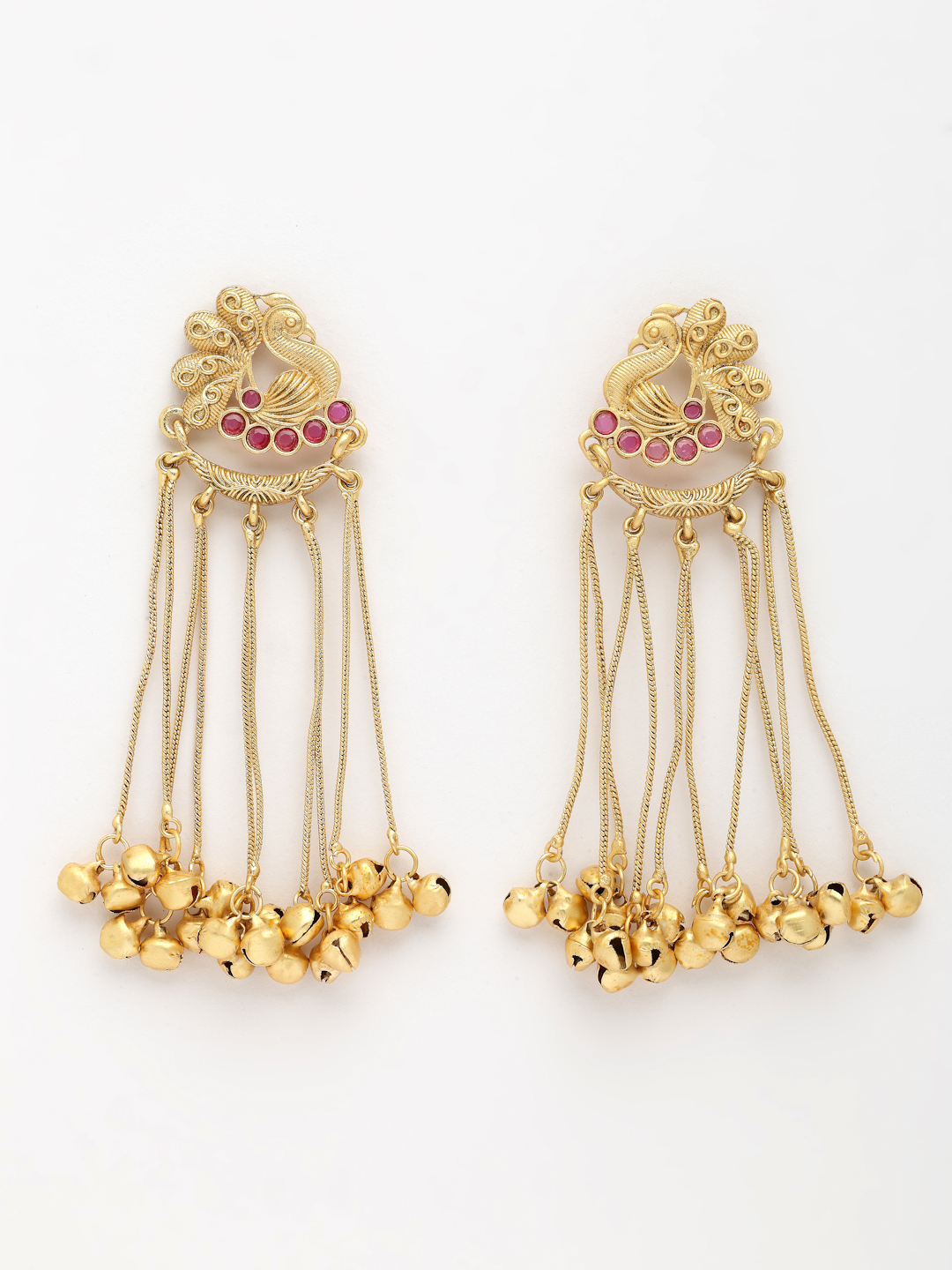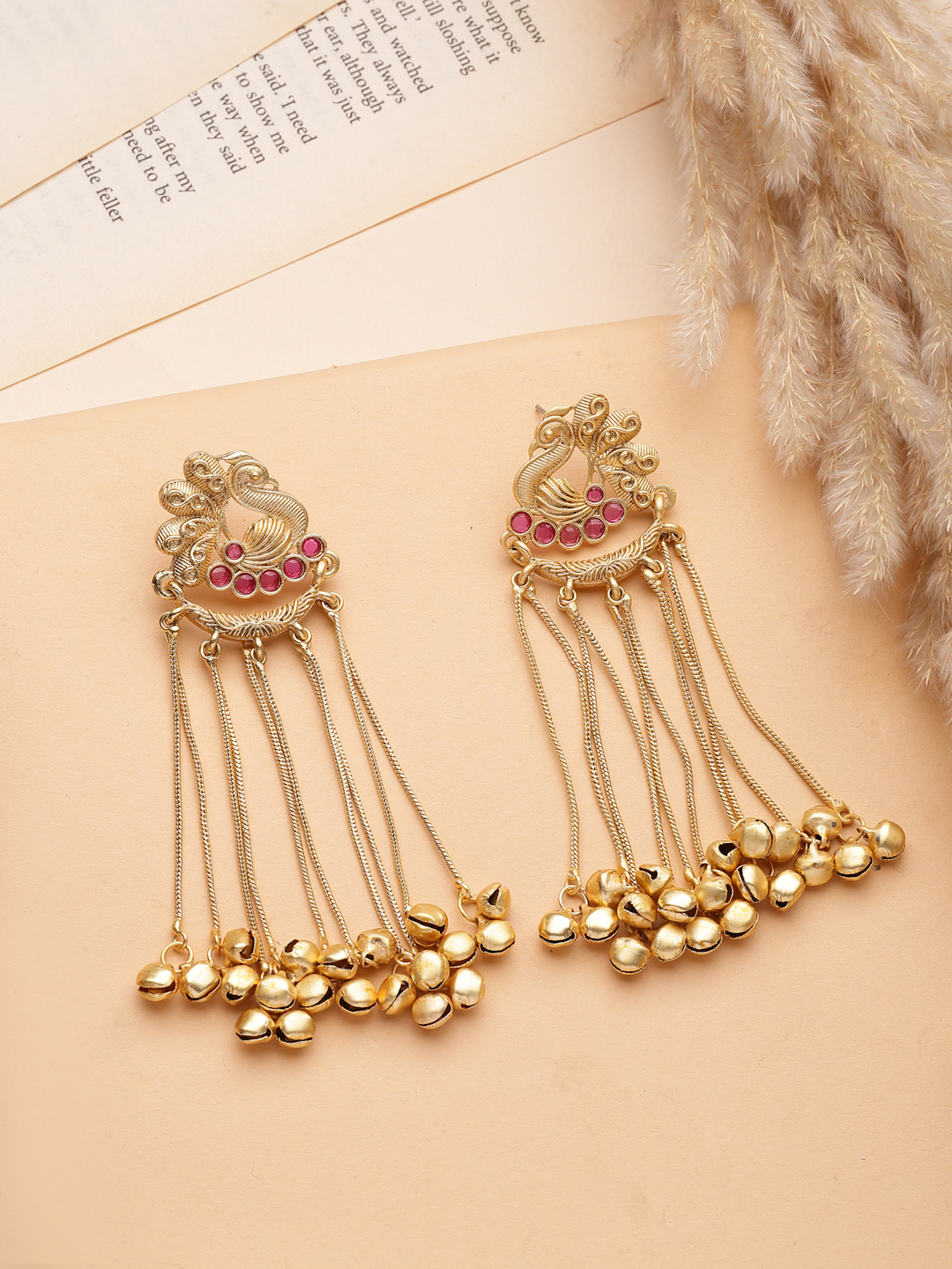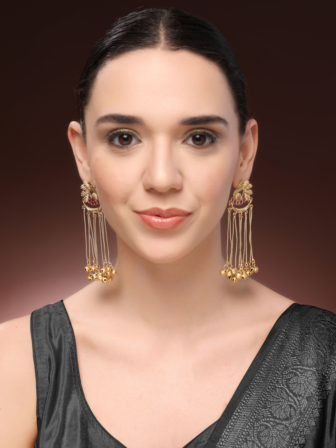 Channel regal elegance with OZ Jewels Gold-Plated Peacock Kashmiri Earrings. Featuring a majestic peacock-shaped stud adorned with vibrant ruby-red stones and long, multi-layered golden chains finished with charming ghungroos, these “Saharey” style earrings are the ultimate statement piece for weddings and festive ethnic looks.