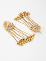 These earrings feature the signature Kashmiri Saharey style—seven delicate, long-flowing golden chains that descend from the main motif. Each chain is finished with a polished golden bead (ghungroo), creating a graceful waterfall effect that moves beautifully with you. These long chains can be worn hanging loose or pinned back into the hair for a traditional, queenly bridal aesthetic.