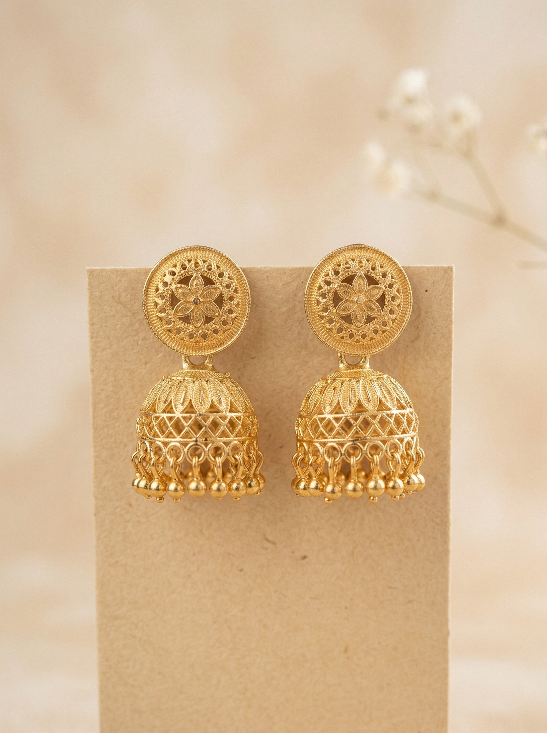 The design features a beautiful circular stud with a central floral motif, surrounded by fine jal (filigree) work. The dome-shaped Jhumka is intricately textured with a honeycomb pattern and a leafy border, leading to a row of delicate gold-plated beads. The matte-gold finish gives the piece an authentic “solid gold” look, making it a sophisticated addition to your jewelry box.